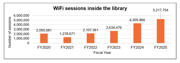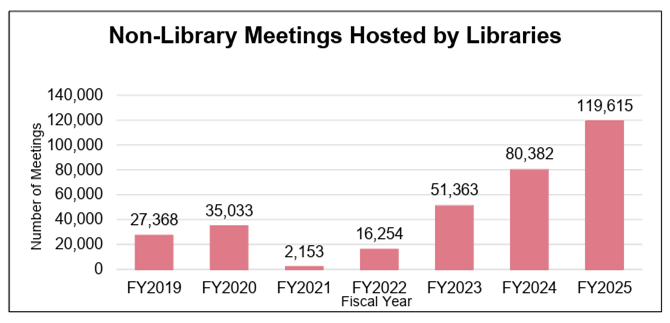 The number of non-library community meetings held in libraries rose to over 80,000 in FY2025, a number that continues to rise with an increase of over 56% from last year, demonstrating the libraries meeting communities’ needs for space.