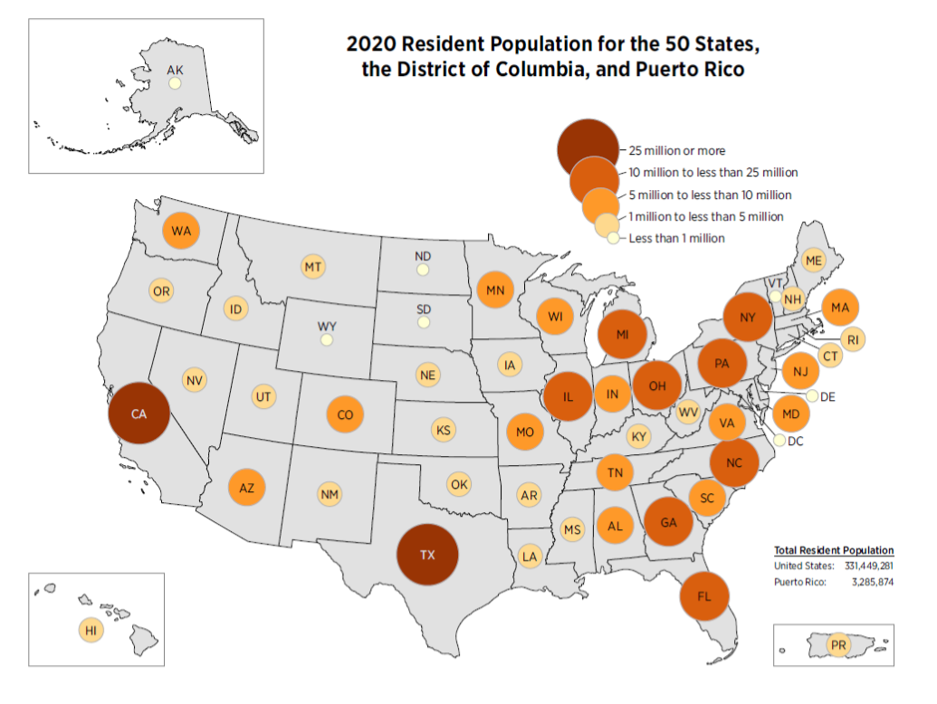 The U.S. population was 331,449,281, an increase of 7.4% from 2010. The 2020 Census marked the 24th census in U.S. history and the first time that households were invited to respond to the census online.