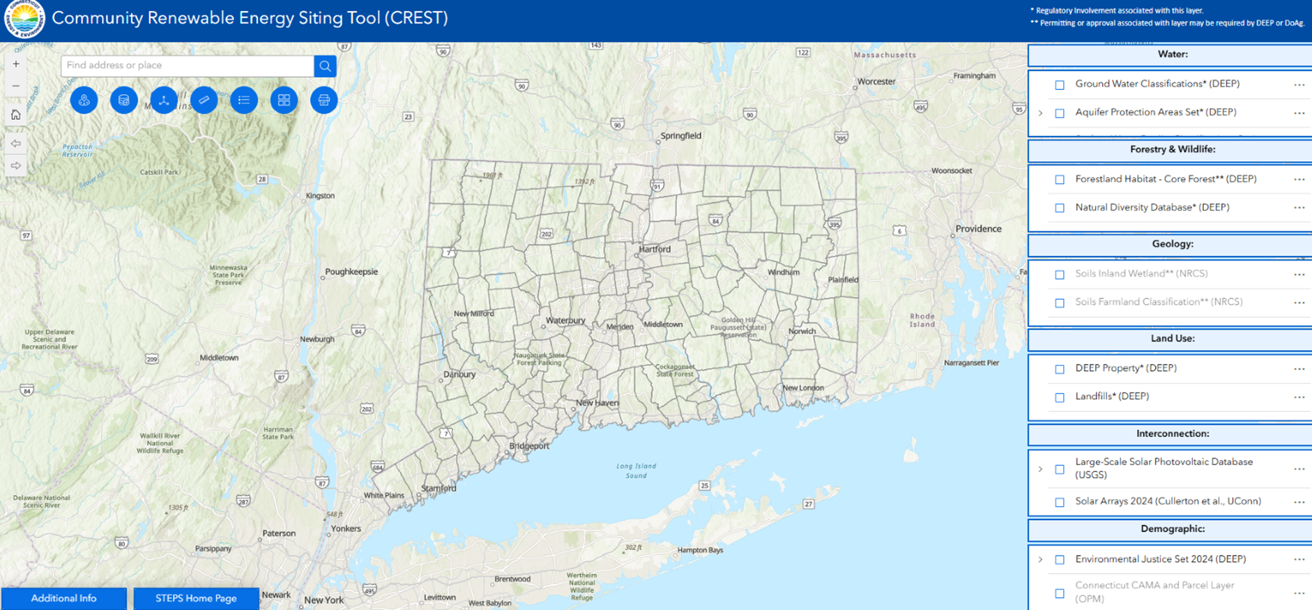 Developed in partnership with the University of Connecticut’s Center for Land Use Education and Research (UConn CLEAR), the Community Renewable Energy Siting Tool (CREST) uses Geographic Information Systems (GIS) mapping to display data in a compelling, easy-to-access format. CREST is free to the public and does not require specialized GIS software to use.