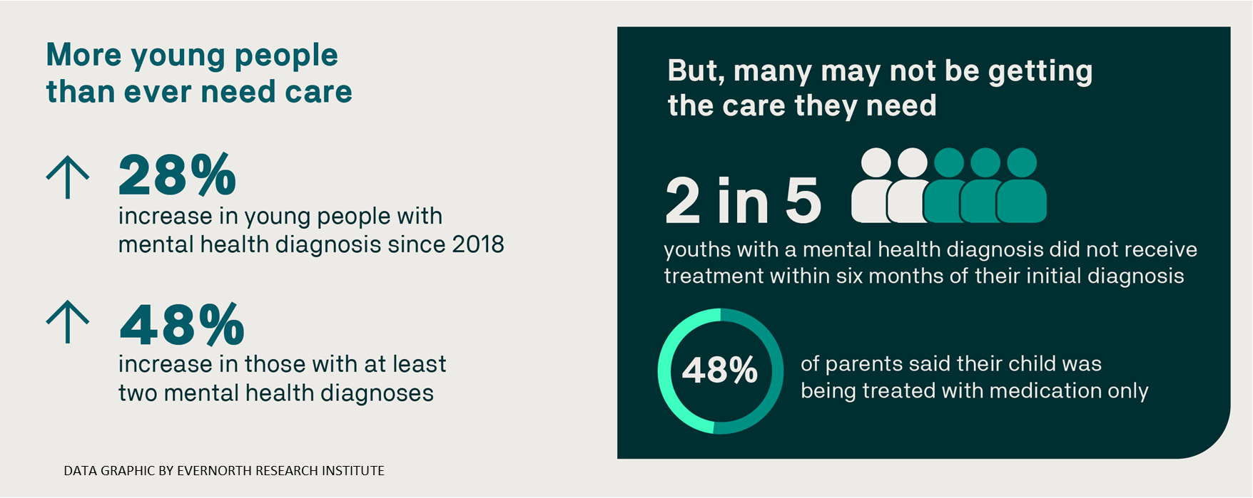 According to an analysis by The Cigna Group’s Evernorth Research Institute, the number of young people with mental health conditions has increased 28% since 2018, and the number of young people with at least two mental health diagnoses has risen 48% over the same period.